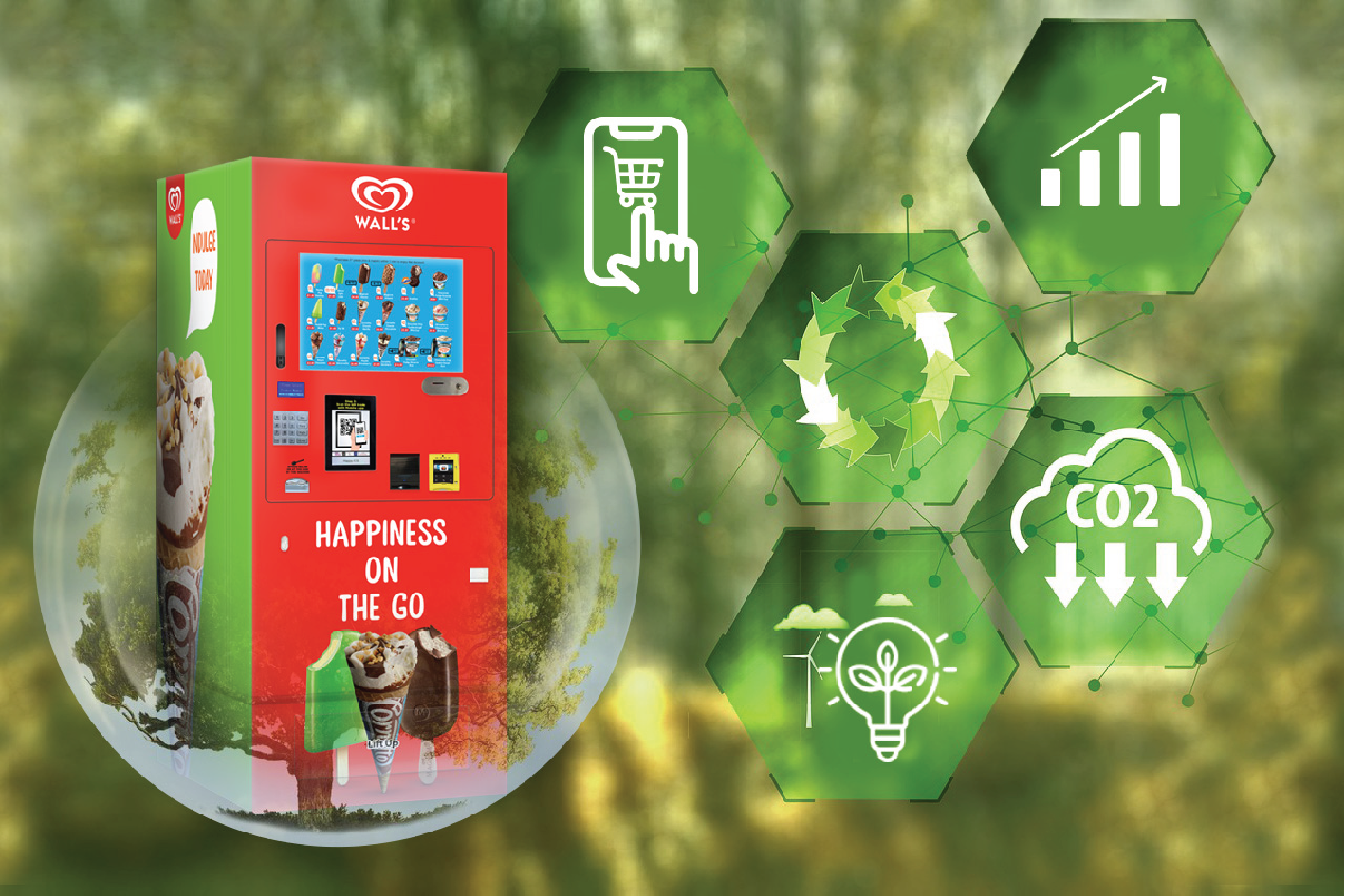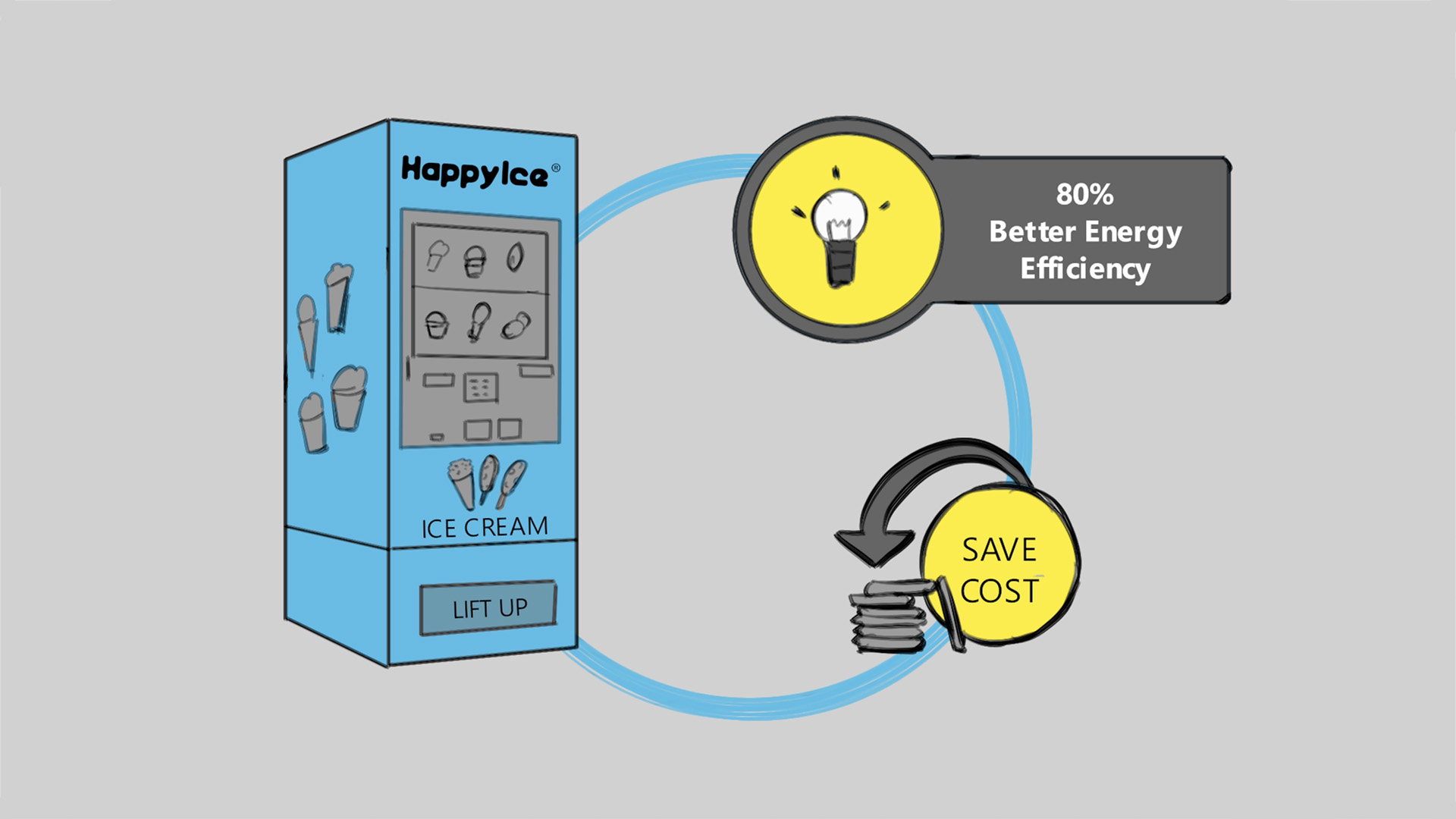 HappyIce is an ice cream vending machine that enables Online-to-Offline ice cream access 24/7 with live-stream data. Indulge in guilt-free ice cream enjoyment with Grab’s eco-friendly approach. This brief guide outlines the process of ordering ice cream through Grab, collecting it from a nearby vending machine by a Grab rider, and receiving doorstep delivery—all within a sustainable 2.5km radius. Due to the short distance to the ice cream vending machine, consumers are able to enjoy ice cream in less than 25 minutes.