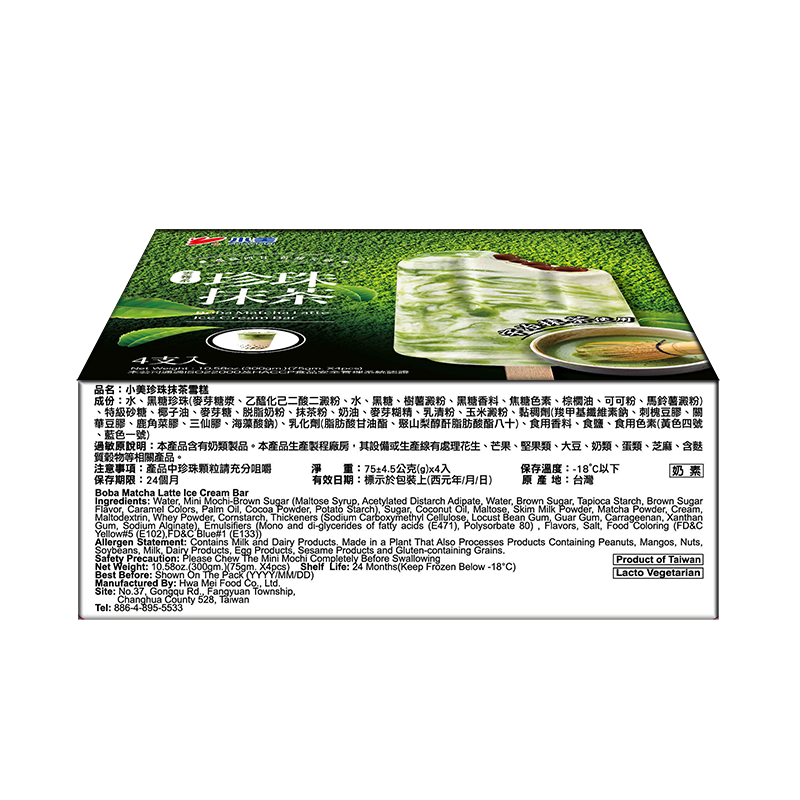 Ingredients: Water, Mini Mochi-Brown Sugar (Maltose Syrup, Acetylated Distarch Adipate, Water, Brown Sugar, Tapioca Starch, Brown Sugar Flavor, Caramel Colors, Palm Oil, Cocoa Powder, Potato Starch), Sugar, Coconut Oil, Maltose, Skim Milk Powder, Matcha Powder, Cream, Maltodextrin, Whey Powder, Cornstarch, Thickeners (Sodium Carboxymethyl Cellulose, Locust Bean Gum, Guar Gum, Carrageenan, Xanthan Gum, Sodium Alginate), Flavors, Emulsifiers (Mono and di-glycerides of fatty acids (E471), Polysorbate 80), Salt, Food Coloring (FD&C Yellow#5 (E102), FD&C Blue#1 (E133))
