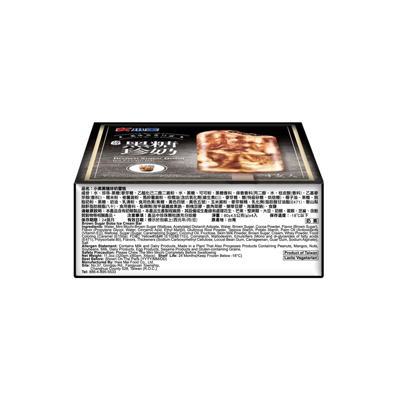 Ingredients: Water, Mini Mochi-Brown Sugar (Maltose, Acetylated Distarch Adipate, Water, Brown Sugar, Cocoa Powder, Flavor (Brown Sugar), Flavor (Propylene Glycol, Water, Cinnamic Acid, Ethyl Maltol), Glutinous Rice Powder, Tapioca Starch, Potato Starch, Palm Oil (Antioxidants (Vitamin E))), Maltose, Sugar (Sugar, Caramelizing Sugar), Coconut Oil, Fructose, Skim Milk Powder, Brown Sugar, Cream, Whey Powder, Food Coloring (Caramel (E150a), FD&C Yellow#5 (E102&E110)), Cornstarch, Maltodextrin, Emulsifiers (Mono and di-glycerides of fatty acids (E471), Polysorbate 80), Flavors, Thickeners (Sodium Carboxymethyl Cellulose, Locust Bean Gum, Carrageenan, Guar Gum, Sodium Alginate), Salt