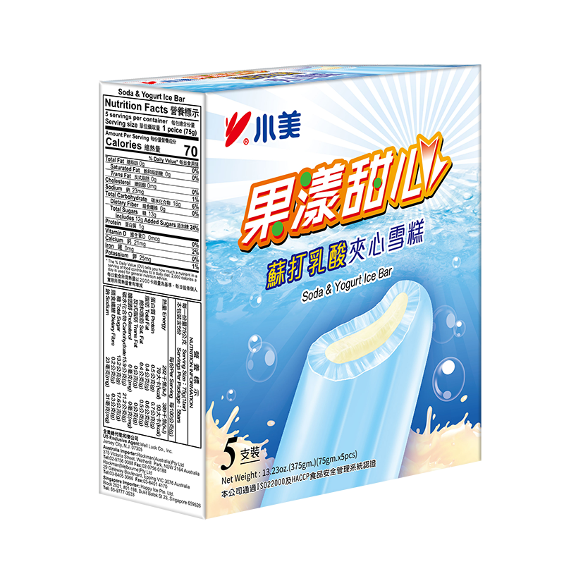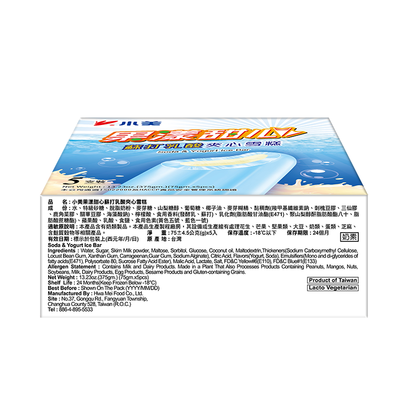 Ingredients: Water, Sugar, Skim Milk powder, Maltose, Sorbitol, Glucose, Coconut oil, Maltodextrin,Thickeners(Sodium Carboxymethyl Cellulose, Locust Bean Gum, Xanthan Gum, Carrageenan,Guar Gum, Sodium Alginate), Citric Acid, Flavors(Yogurt, Soda), Emulsifiers(Mono and di-glycerides of fatty acids(E471), Polysorbate 80, Sucrose Fatty Acid Ester), Malic Acid, Lactate, Salt, FD&C Yellow#6(E110), FD&C Blue#1(E133)